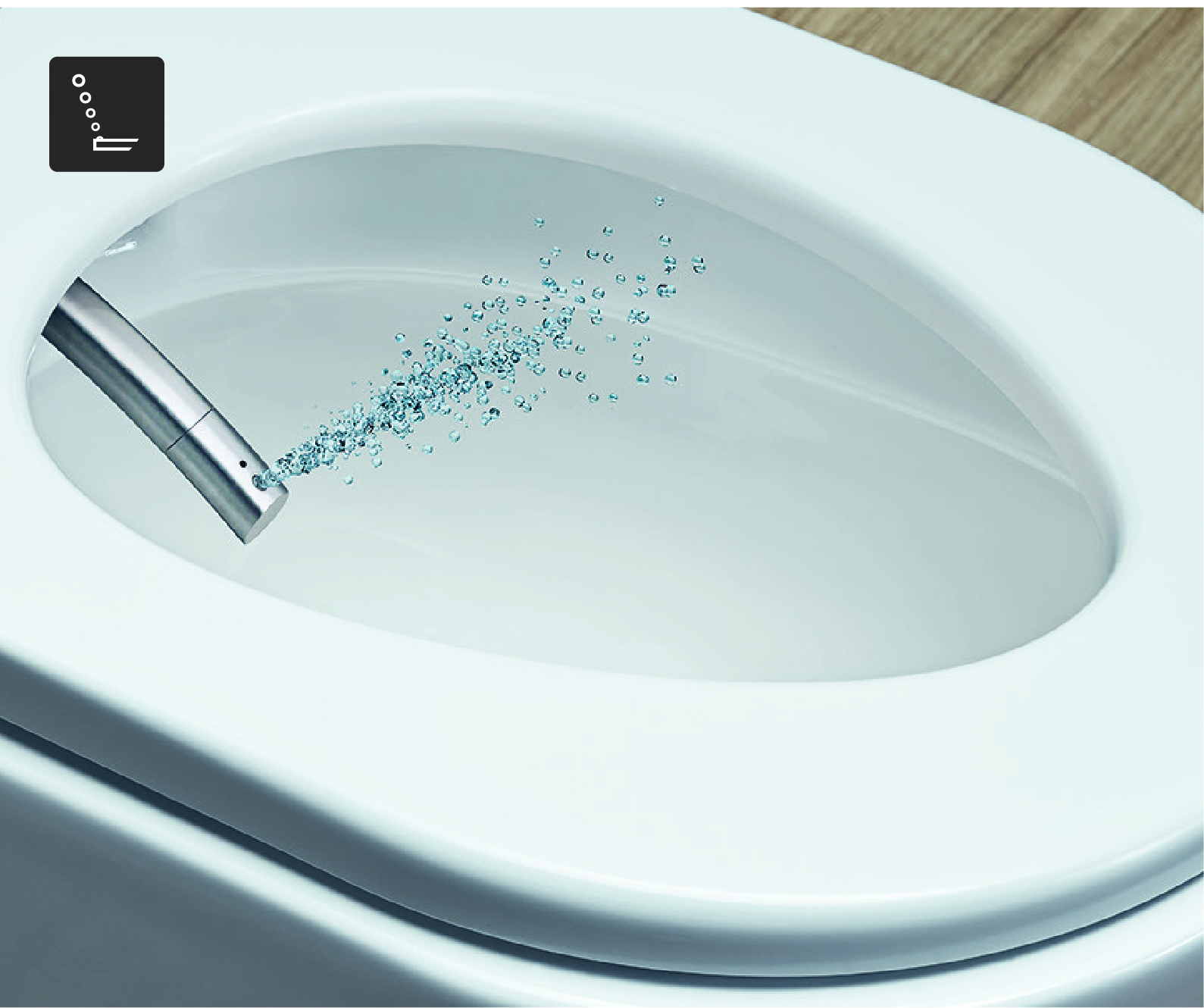 當您走近SensoWash® i Plus時,其座蓋將會自動掀起,並進行座圈加溫,利於使用者如廁。而於使用完畢之後,將行自動沖水功能,並蓋上座蓋,以維持衛浴空間的整潔與衛生。