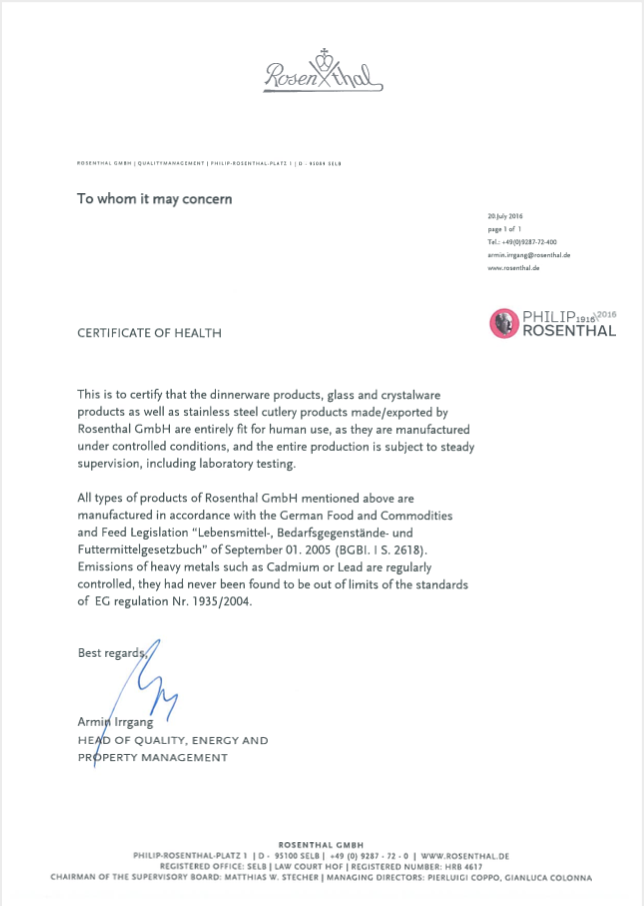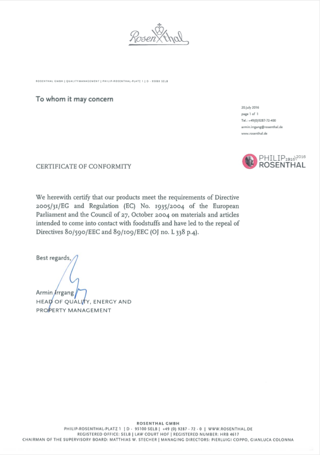 Rosenthal GmbH是德國最傳統卻又最現代的品牌商品公司之一。成立超過135年,如今為終端消費者以及挑剔的美食及飯店業的專業人士開發瓷器產品和室內裝飾系列。這些產品具有您對德國製造產品所期望的卓越設計、功能、品質及製造標準,同時也體現不斷創新的精神。
